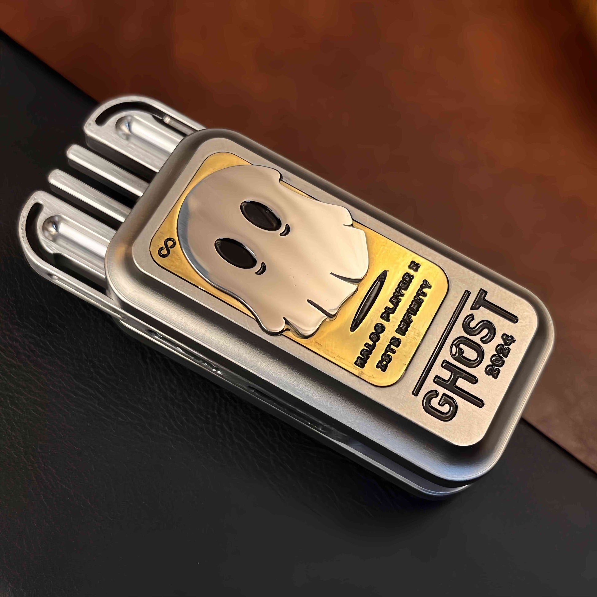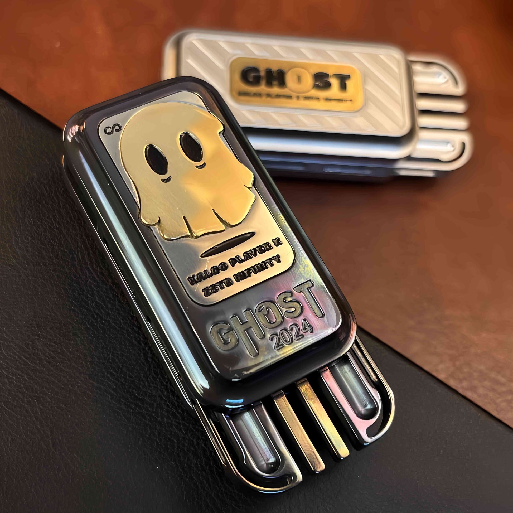 The Ghost Block Slider is a stylish and functional fidget toy featuring a mysterious ghost pattern on its surface, adding a touch of personality. It is available in stainless steel and zirconium alloy versions, offering distinct textures and a premium feel. With a precision tuning fork mechanism inside, each push produces a crisp, resonant 'ding' sound that echoes, delivering an exquisite auditory experience.