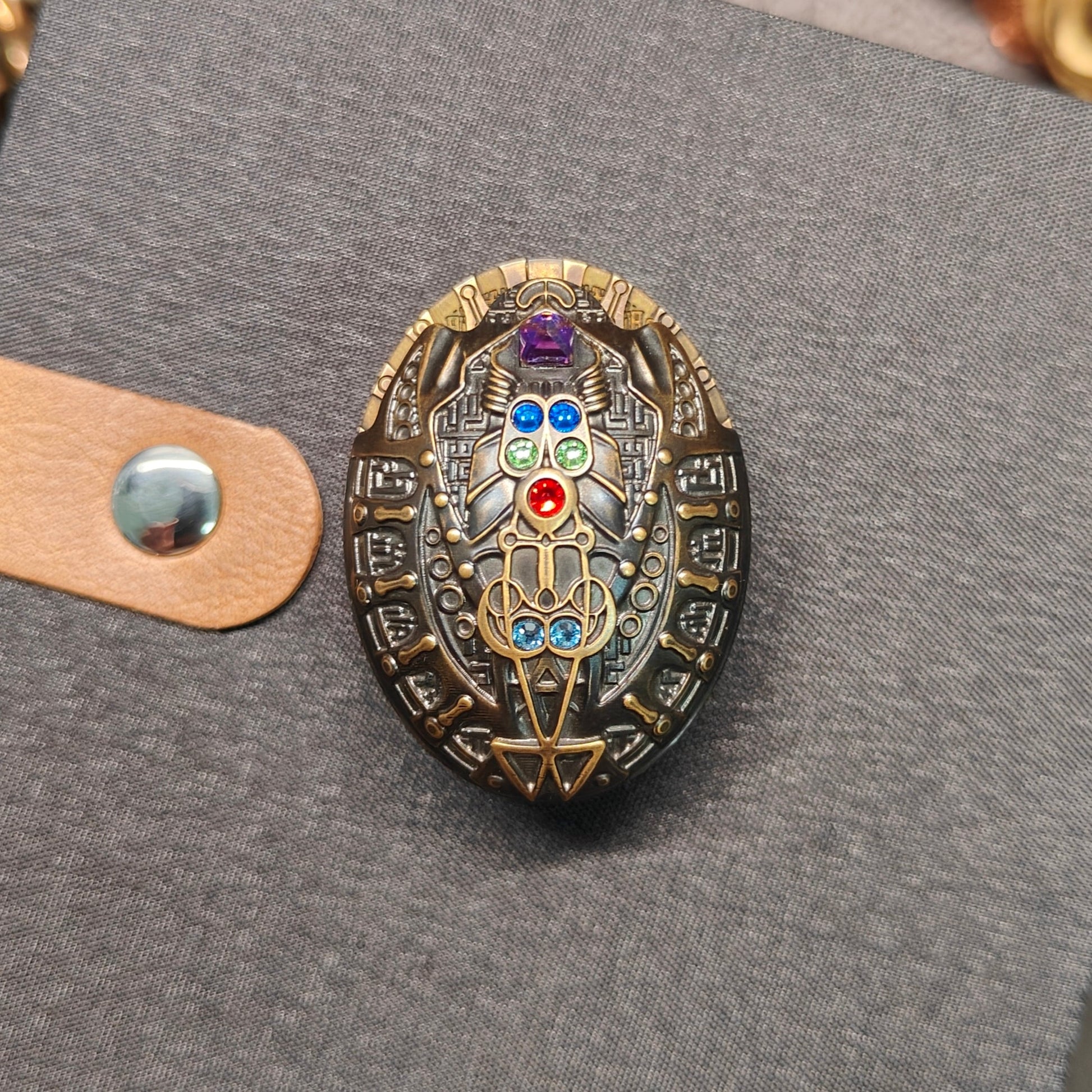 Design: Inspired by the ancient symbol of the scarab beetle, the surface is adorned with multiple colorful gemstones, delivering a bold, eye-catching aesthetic and collectible value.